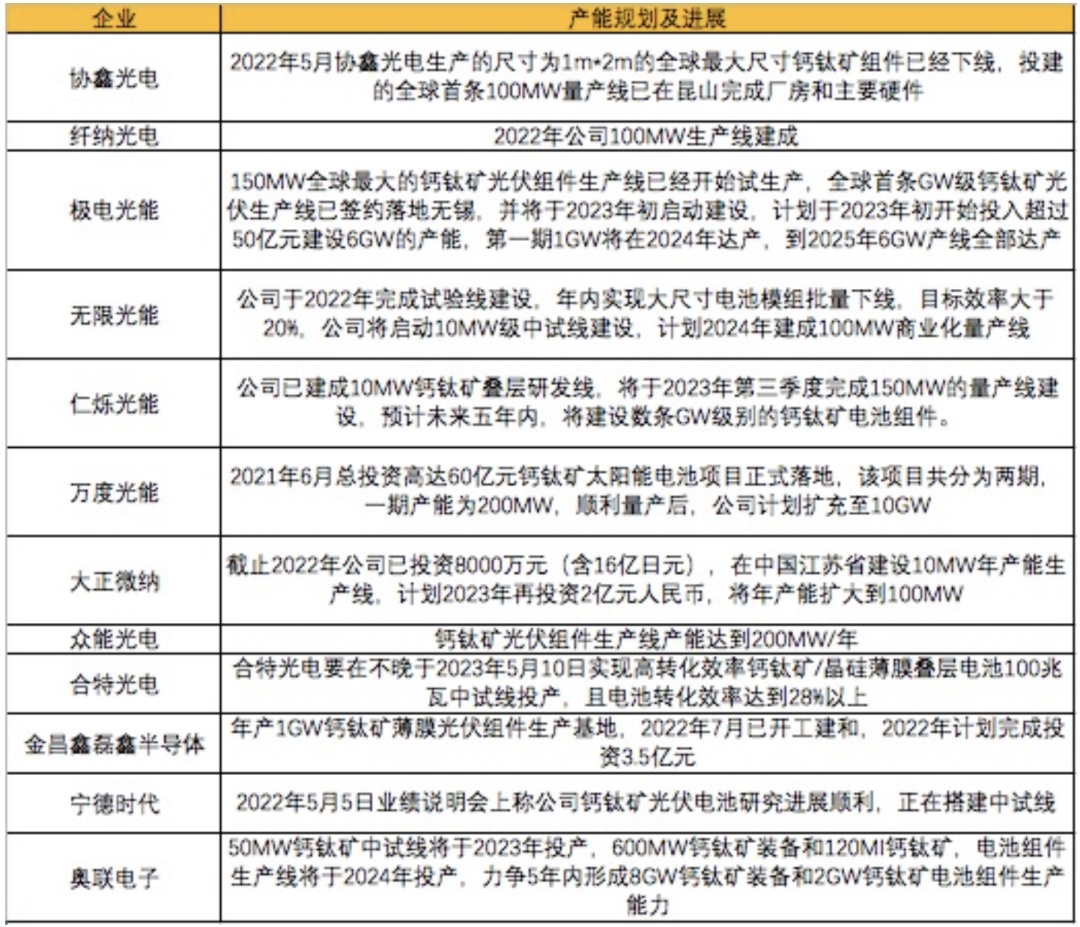 目前根据最新的信息披露,国内协鑫光电、纤纳光电、极电光能等12家公司均已建立钙钛矿产线,依据中金公司预测,2023年国内全行业扩产规模乐观情况下有望达到六条1000MW产线,在百兆瓦产线进度上领跑的纤纳光电、协鑫光电、极电光能均在2023年可能有GW级产线扩产计划,钙钛矿新锐们正在全速奔跑。