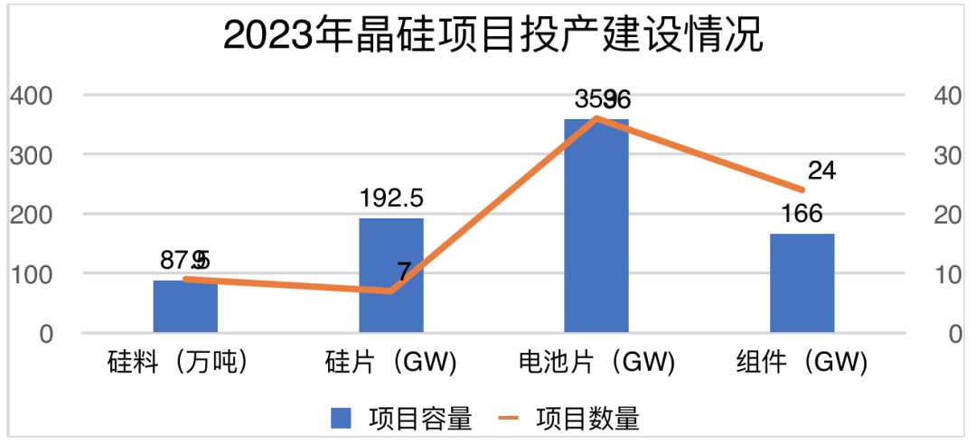 据公开数据不完全统计,老牌晶硅企业及跨界晶硅企业2023年晶硅电池片共计36个项目投建,项目容量达到359GW,涉及资金约2663.16亿元。组件项目共计24个项目投建,项目容量166GW,涉资1028亿元。