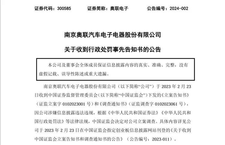 在今晚的公告中,奥联电子介绍,公司于2023年2月23日收到中国证监会下发的《立案告知书》和《调查通知书》,因公司涉嫌信息披露违法违规,根据《证券法》《行政处罚法》等法律法规,中国证监会决定对公司立案调查。2024年2月7日,公司收到中国证监会下发的《行政处罚事先告知书》,主要内容如下:“奥联电子、陈光水、胥明军、薛娟华女士、傅宗朝、蒋飚:奥联电子涉嫌信息披露违法违规一案已由证监会调查完毕,证监会依法拟对你们作出行政处罚。