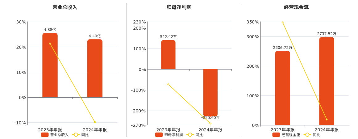 公司营业总收入为4.40亿元,较去年同报告期营业总收入减少4807.62万元,同比较去年同期下降9.85%。归母净利润为-850.60万元,较去年同报告期归母净利润减少1373.02万元,同比较去年同期下降262.82%。经营活动现金净流入为2737.52万元。