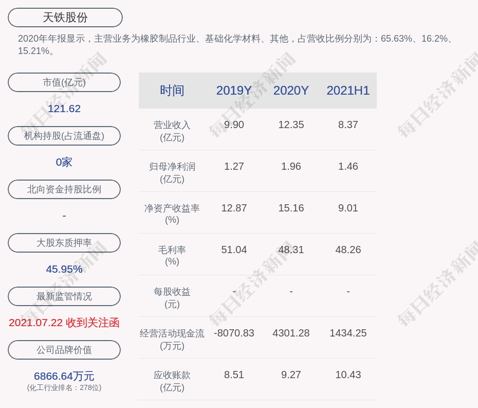 2020年年报显示,天铁股份的主营业务为橡胶制品行业、基础化学材料、其他,占营收比例分别为:65.63%、16.2%、15.21%。