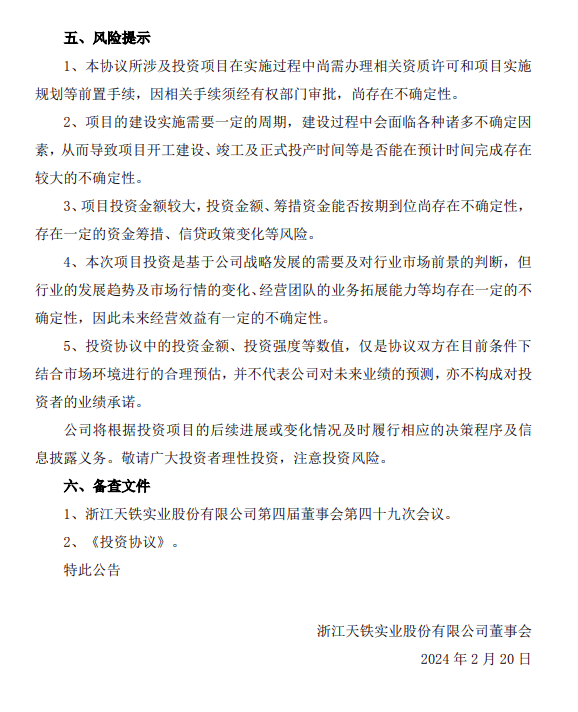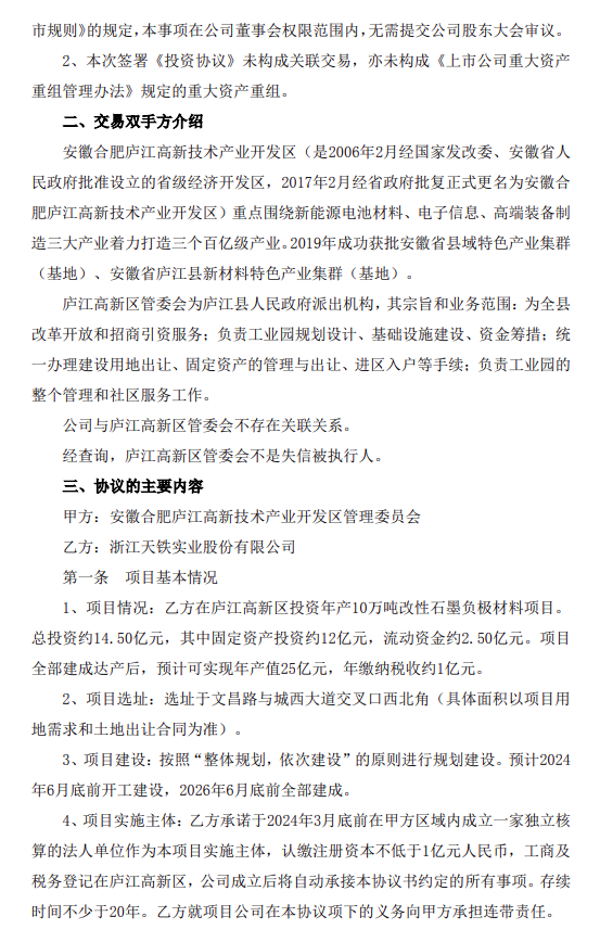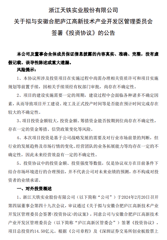 近日,天铁股份发布关于拟与安徽合肥庐江高新技术产业开发区管理委员会签署《投资协议》的公告。