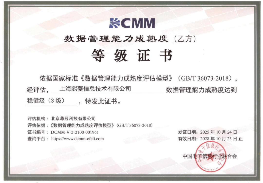 近日,依据国家标准《数据管理能力成熟度评估模型》(GB/T 36073-2018,简称“DCMM”),经中国电子信息行业联合会认证评估和专家团队严格评审,熙菱信息(股票代码:300588)成功通过“数据管理能力成熟度稳健级(3级)”认证,标志着公司数据管理能力通过国家标准检验,迈入行业前列。