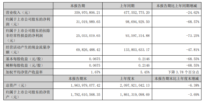 此外,基本每股收益0.0675元,同比下降68.55%;加权平均净资产收益率1.67%,较上年同期下降3.78个百分点。截至报告期末,公司总资产19.64亿元,同比下降6.38%;归属于上市公司股东的净资产17.93亿元,减少3.69%。