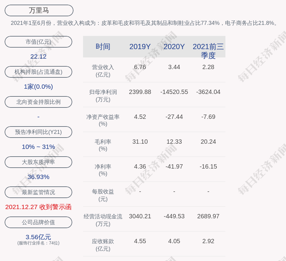2021年1至6月份,万里马的营业收入构成为:皮革和毛皮和羽毛及其制品和制鞋业占比77.34%,电子商务占比21.8%。