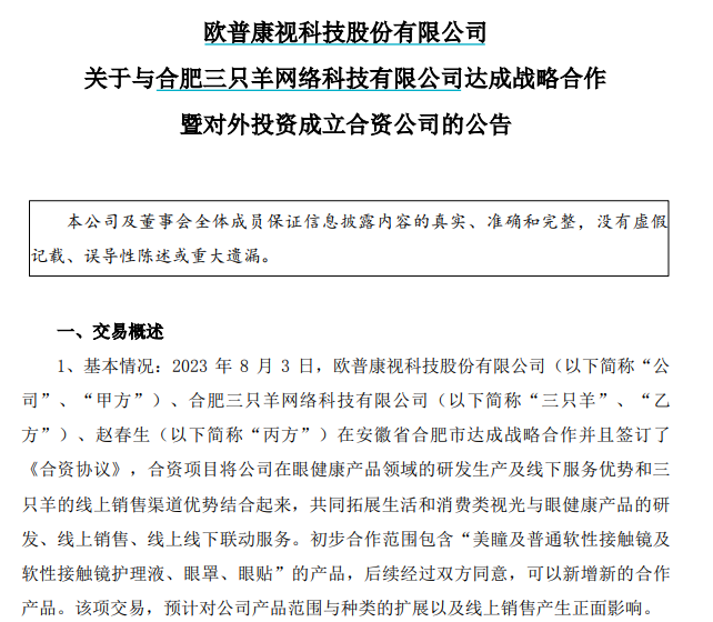 据欧普康视公告,该公司由三方出资组成。其中,欧普康视出资1710万元、三只羊出资1200万元、赵春生出资90万元,三方合计出资3000万元,设立合肥欧普三羊眼健康科技有限公司(拟用名,最终以工商机关核定的名称为准)。本次投资完成后,欧普康视将持有合资公司57%的股权,合资公司将成为公司控股子公司,纳入公司合并报表范围。