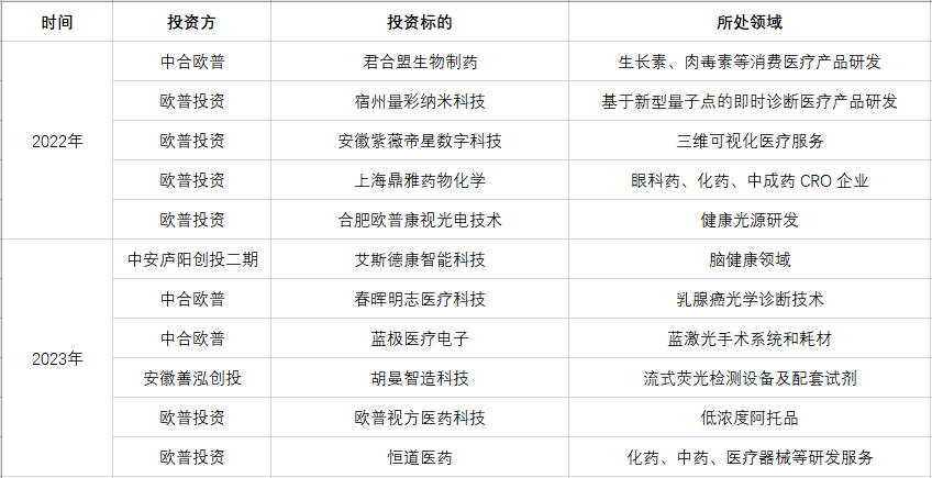 自2022年末起,欧普康视进一步加快了参投基金的脚步。2022年11月至2023年1月期间,欧普康视通过全资子公司欧普投资先后参投了安徽善泓创投、合肥英飞欧普以及中安庐阳创投二期共三只创投基金,分别出资1.15亿元、3.49亿元以及4000万元。上述三只基金的投资方向均为眼科和眼视光产品,及其它有市场潜力的生命健康类产品。