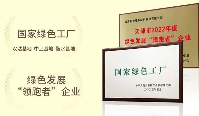 自成立以来,利安隆一直坚持可持续发展,并不断创新,以履行其对环保和社会责任的承诺。一方面,利安隆积极响应“双碳”号召,搭建ISO14001、ISO45001、ISO50001体系,打造环保节能型发展企业。不仅首批被天津市生态环境局、发改委等六个部门授予“天津市2022年度绿色发展‘领跑者’企业”荣誉称号,且利安隆汉沽基地、中卫基地和衡水基地也均荣获了“国家绿色工厂”称号。另一方面,利安隆致力于“让材料延长寿命,为人类节约资源”,用出色的产品,帮助材料持久耐用与回收再利用,助力材料绿色发展。