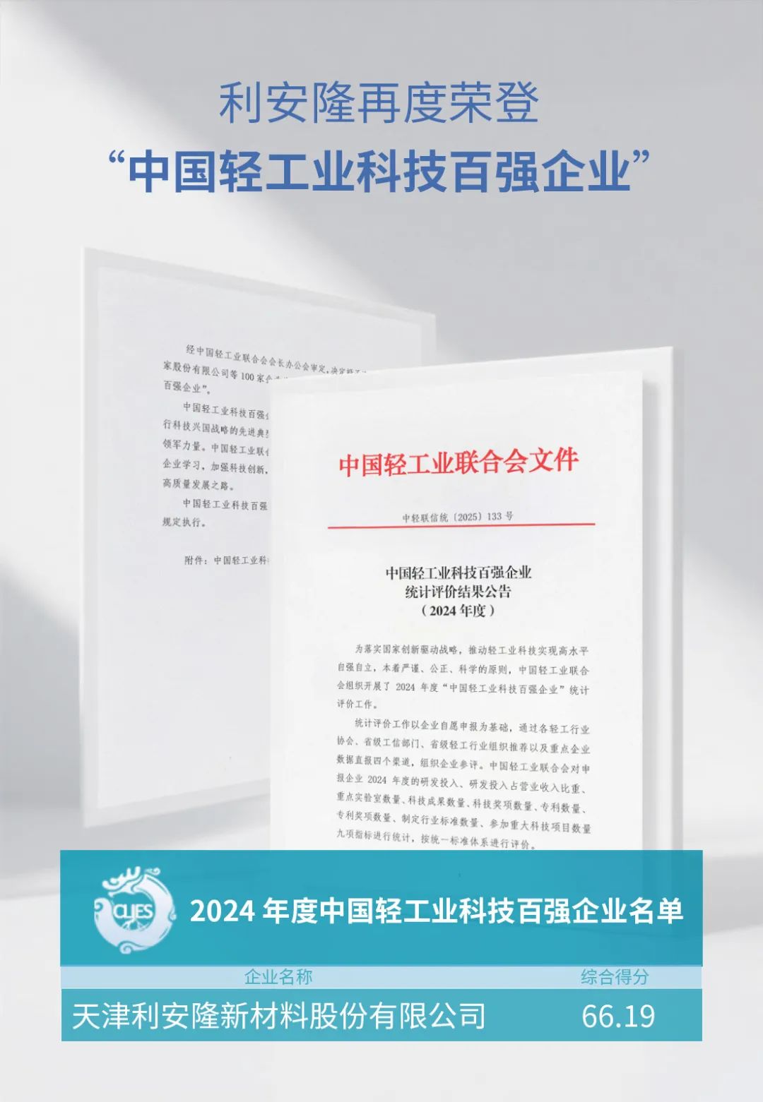 近期,以“聚焦向‘新’力领航新消费”为主题的轻工业百强企业新质发展产业大会在北京隆重召开。会上正式发布2024年度中国轻工业科技百强企业名单,利安隆凭借在高分子材料抗老化助剂领域的技术创新与产业贡献,再次登榜,此次位列第61位,再度彰显了公司在行业中的科技领先地位与可持续发展实力。