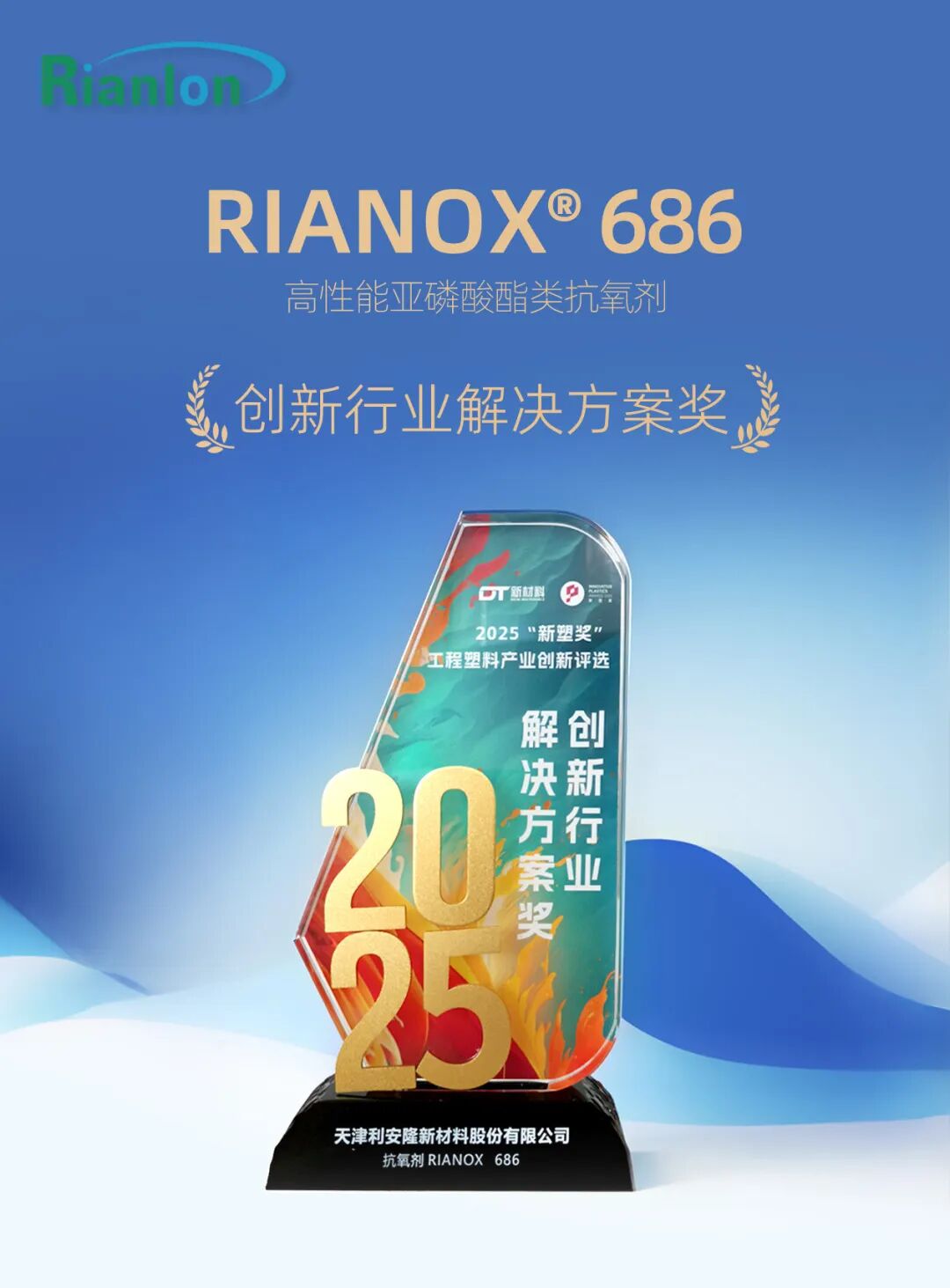 2025年9月10-12日,2025高分子产业年会在合肥成功举办。在大会开幕式暨“新塑奖”颁奖盛典中,利安隆凭借高端抗氧剂产品RIANOX? 686的技术突破,在众多参评项目中脱颖而出,荣获“创新行业解决方案奖”,彰显公司在高分子抗老化领域的硬核实力。