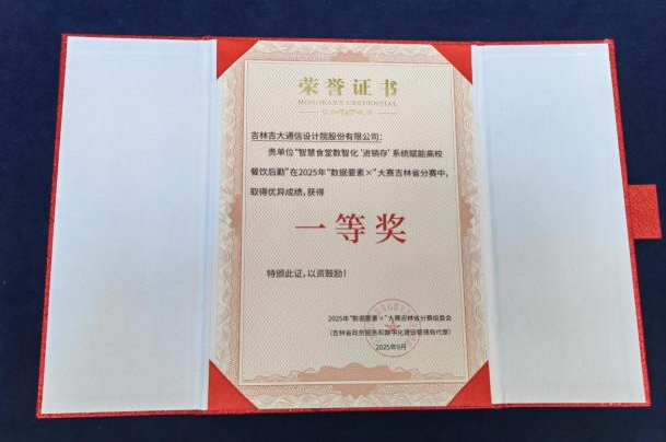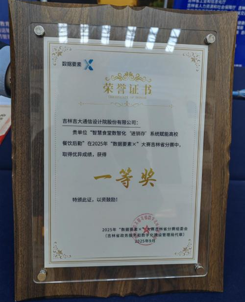 2025年9月24日,由吉林省政务服务和数字化建设管理局等部门主办,吉林市政务服务和数字化建设管理局承办的2025年“数据要素×”大赛吉林省分赛颁奖典礼暨数字经济产业招商推介会在北国江城吉林市圆满落幕。吉大通信凭借《智慧食堂数智化“进销存”系统赋能高校餐饮后勤》项目在众多参赛团队中脱颖而出,荣获一等奖,并成功晋级全国总决赛。
