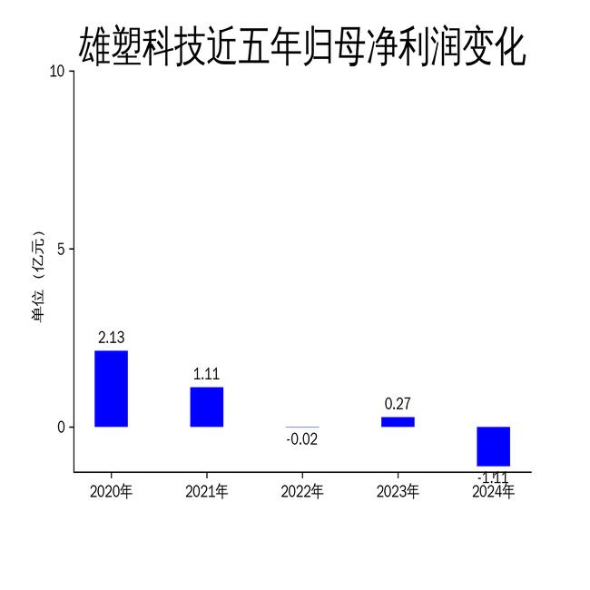2025年4月20日,雄塑科技发布了2024年年报。报告显示,公司实现营业总收入10.31亿元,同比下降20.21%;归属于上市公司股东的净利润为-1.11亿元,同比大幅下滑513.04%。扣非净利润同样表现不佳,亏损1.23亿元,同比下降1516.16%。公司主要业务为塑料管材、塑料制品及配套产品的研发、生产与销售,尽管在多个领域有所布局,但受外部环境影响,业绩表现不佳。