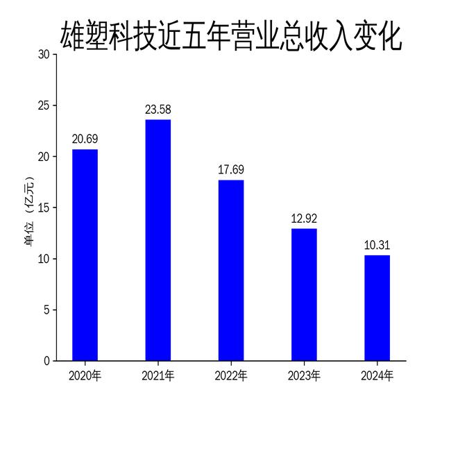2024年,雄塑科技的营业总收入为10.31亿元,较2023年的12.92亿元下降了20.21%。毛利润也从2.12亿元大幅减少至1.02亿元,降幅达51.89%。归属净利润和扣非净利润均出现巨额亏损,分别为-1.11亿元和-1.23亿元,同比分别下降513.04%和1516.16%。这一系列数据反映出公司在2024年面临的严峻经营压力。