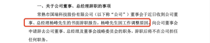 9月15日,国瑞科技(300600.SZ)迎来高层震动。公司公告显示,董事、总经理杨峰因工作调整递交辞呈,即日起不再担任任何职务,任期未满便提前离任。与此同时,董事会授权副总经理赵辉章代行总经理职责,直至新任人选到位。