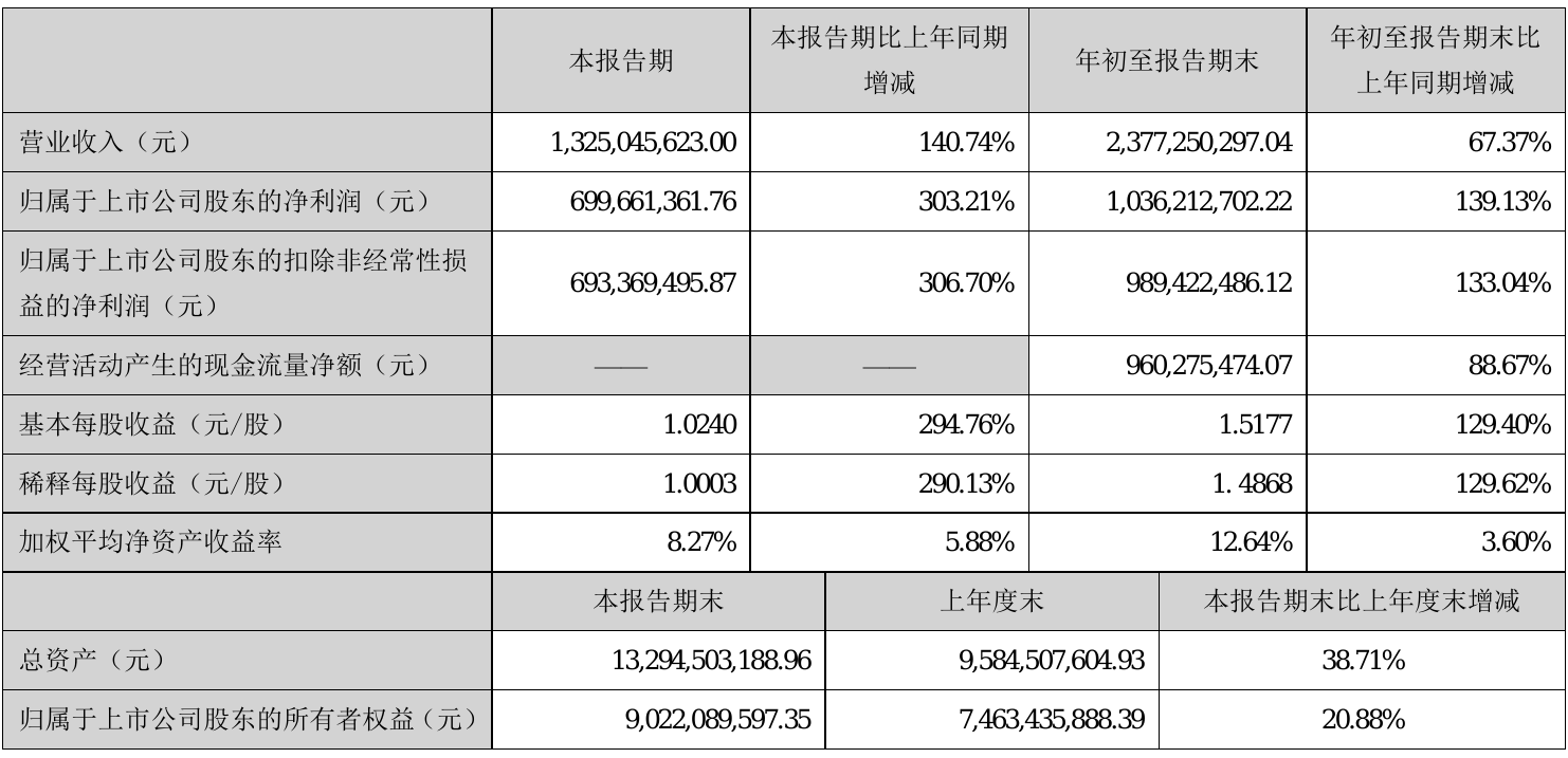 10月21日,康泰生物(300601)近日发布2021年前三季度报告,报告期内营业收入2,377,250,297.04元,同比增加67.37%;净利1,036,212,702.22元,同比净利增加139.13%。