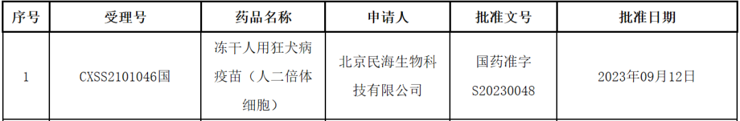 9月15日,中国国家药品监督管理局(NMPA)官网最新公示,康泰生物全资子公司民海生物递交的冻干人用狂犬病疫苗(人二倍体细胞)上市申请已获得批准。公开资料显示,这款疫苗适用于预防狂犬病。