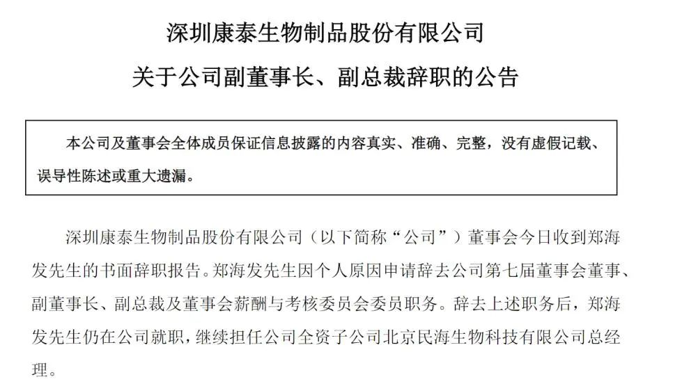 前不久,康泰生物(300601.SZ)发布公告称,郑海发因个人原因将辞去康泰生物董事会董事、副董事长、副总裁及董事会薪酬与考核委员会委员等职务。