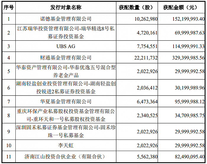 飞荣达5月4日公告,公司本次向特定对象发行A股股票实际已发行人民币普通股6743.08万股,发行价格为14.83元/股,募集资金总额为10亿元;其中财通基金获配3.29亿元,诺德基金获配1.52亿元,UBS AG获配1.15亿元。