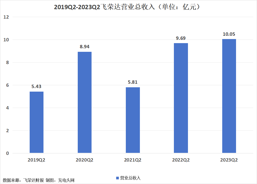 2019-2023年二季度单季度飞荣达分别实现营业总收入5.43亿元、8.94亿元、5.81亿元、9.69亿元、10.05亿元,同比变动分别为76.28%、64.77%、-35.02%、66.85%、3.66%。