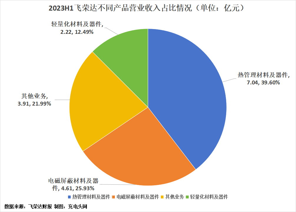 飞荣达2023H1热管理材料及器件营收7.04亿元,占总营收的比例为39.60%;电磁屏蔽材料及器件营收4.61亿元,营收占比25.93%;其他业务营收3.91亿元,占比为21.99%;轻量化材料及器件营收2.22亿元,营收占比12.49%。