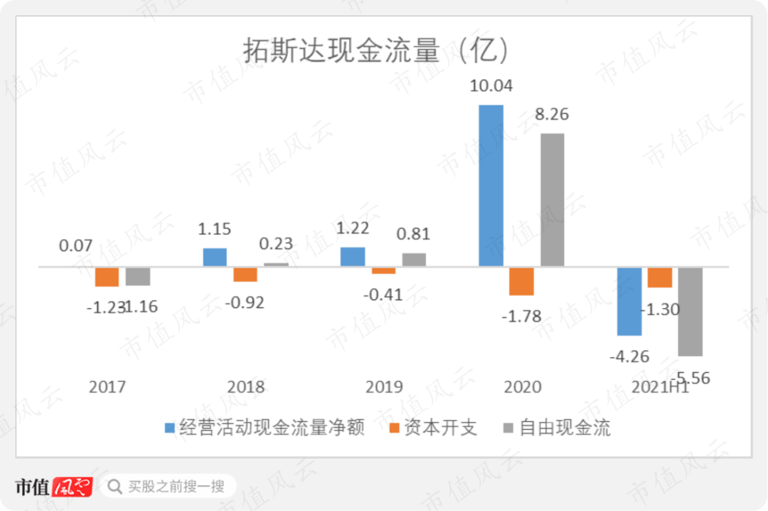 2020年,拓斯达的经营活动现金流净额为10.04亿,自由现金流达到8.26亿,是最为充沛的一年。这主要与口罩机业务全额预收的结算方式有关,口罩机业务也为拓斯达带来了真金白银的流入。