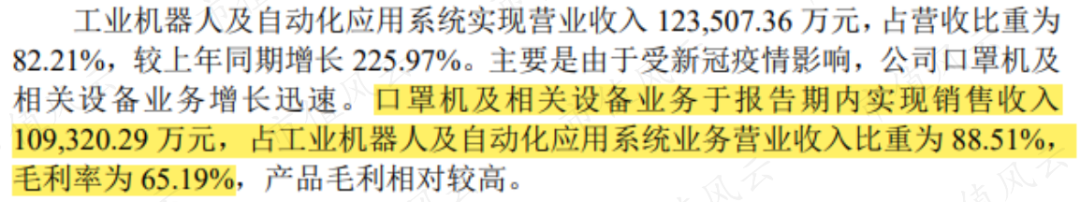 2020年上半年,拓斯达口罩机相关业务实现营收10.93亿,占总营收的70%以上,毛利率高达65.19%。