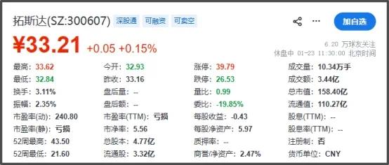 截至1月23日午市休盘,拓斯达(300607.SZ)报33.21元/股,涨0.15%,公司总市值为158.40亿元。
