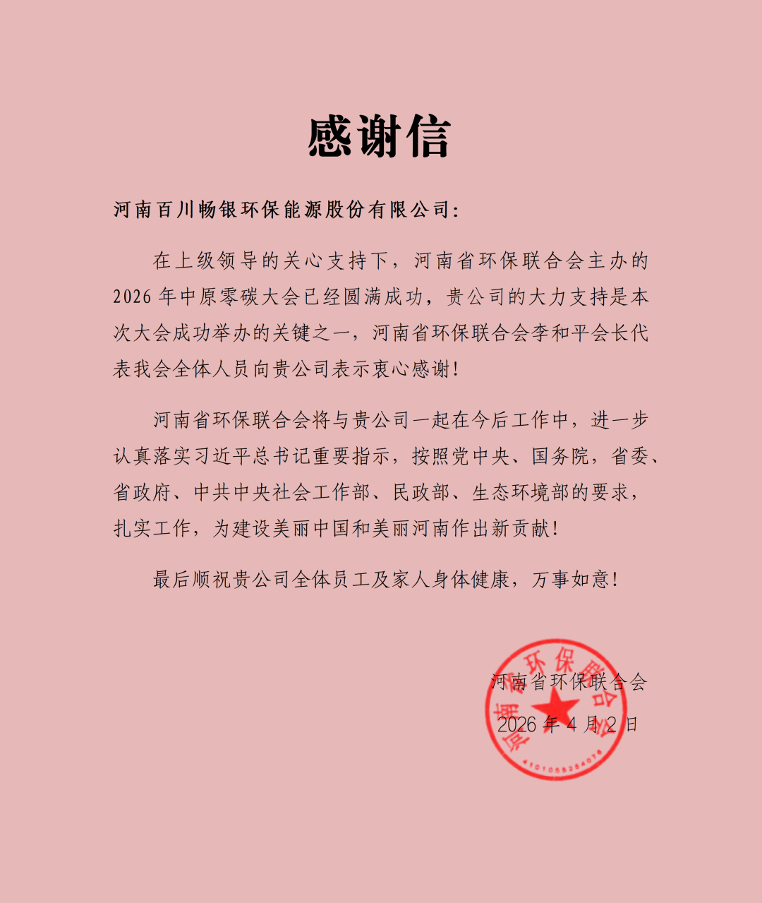 会后,河南省环保联合会对我司发来感谢信: