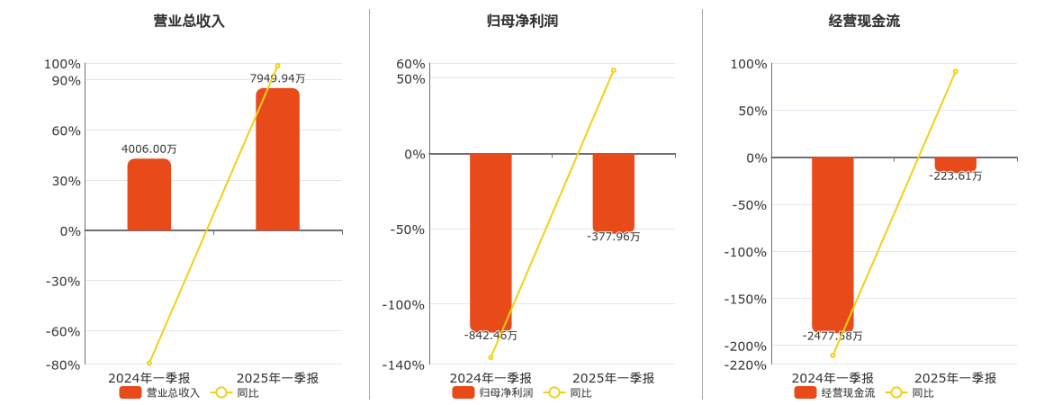 公司营业总收入为7949.94万元。归母净利润为-377.96万元。经营活动现金净流入为-223.61万元。
