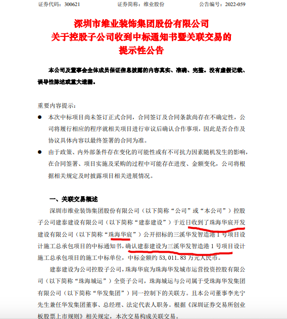 7月12日讯:维业股份(300621)(300621.SZ)发布公告,公司控股子公司建泰建设有限公司(“建泰建设”)于近日收到了珠海华宸开发建设有限公司(“珠海华宸”)公开招标的三溪华发智造港1号项目设计施工总承包项目的中标通知书,确认建泰建设为三溪华发智造港1号项目设计施工总承包项目的施工中标单位,中标金额约5.3亿元人民币。