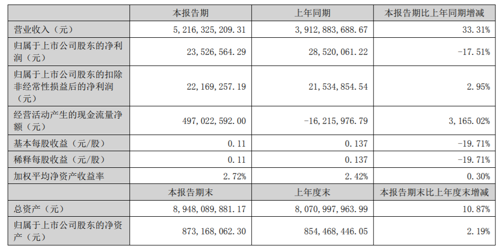 2022上半年,维业股份营业收入52.16亿元,同比增33.31%;归属于上市公司股东的净利润2352.66万元,同比降17.51%;归属于上市公司股东的扣除非经常性损益后的净利润2216.93万元,同比增2.95%。