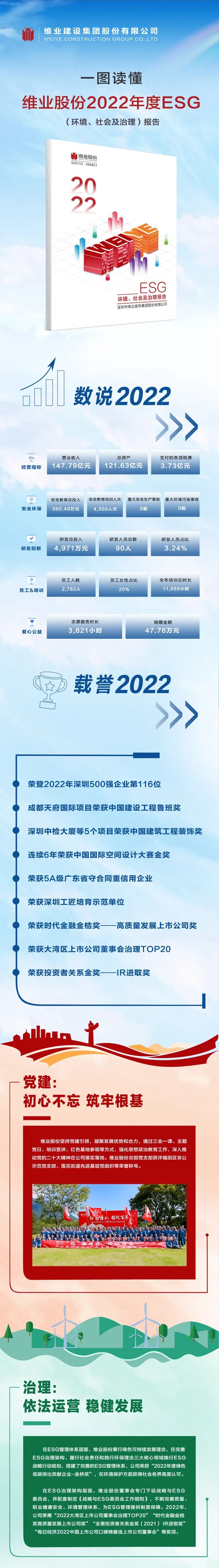 随着可持续发展和“双碳”目标的推进,ESG(即环境、社会和公司治理)愈发受到各界的重视。尤其对于上市公司来说,ESG已成为衡量企业价值、社会贡献以及可持续发展的重要标准;在投资机构的金融实践中,ESG亦被纳入投资标的选择、投资组合构建的框架。2023年,维业股份发布了2022年度ESG报告,这是公司上市以来首份ESG报告,全面展示了公司在公司治理、提供优质服务、团队赋能、社会共建、绿色低碳、企业社会责任等领域的积极举措和成果,彰显了公司ESG治理水平的不断提升,是公司践行可持续发展战略新征程上的重要里程碑。