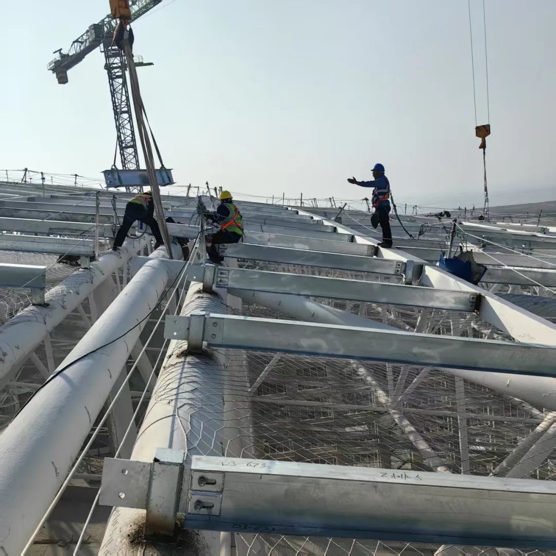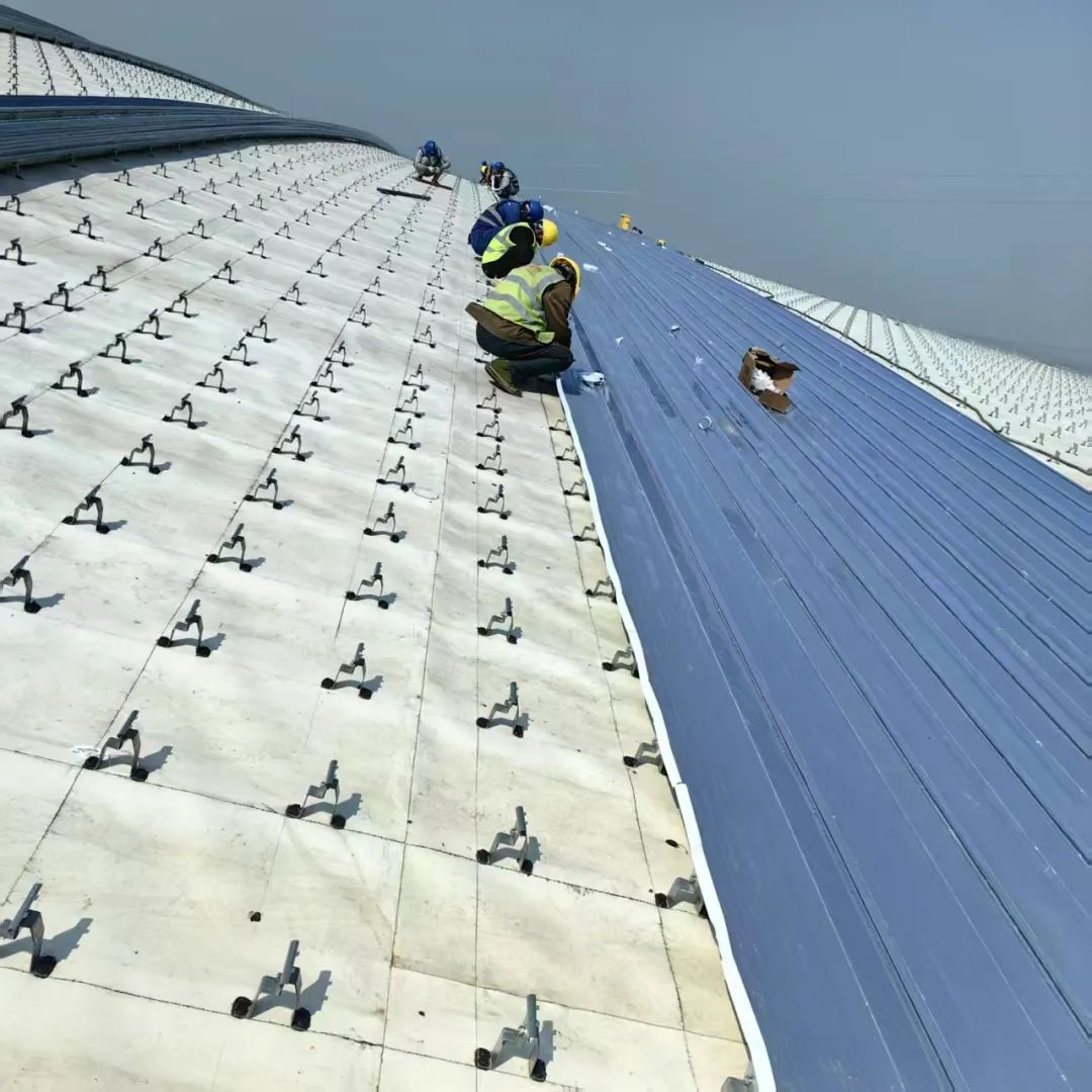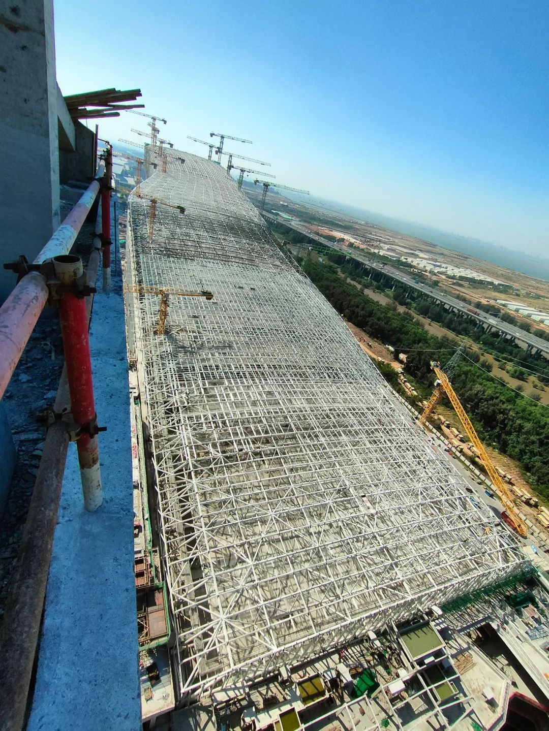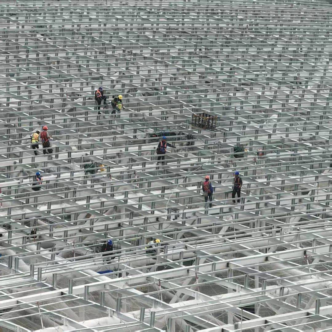 在进度管控方面,项目团队使用“五位一体”计划,在施工任务分区分段基础上,把每个区段的工程量、各种材料、劳动力、措施等全部量化,从材料下单至最后现场安装,形成全链条精细化计划管控。经统计,该金属屋面钢结构有2950个主檩托、5810支主檩条(单支重200kg)、6580支次檩条、18000多支次檩托,总计约50000个焊点,主次檩施工全是高空作业、安装难度高,安全及质量管控难度大。为确保工程的工期和质量,项目团队从2024年11月份起,在施工现场实行夜间加班,施工全过程未发生安全事故;质量员平均每天14个时在悬空高度40m的钢结构网架上共对1万余主次檩条、20000余个檩托、50000多个焊接点进行全部检查,共形成记录照片约60000张,保证了整个金属屋面的安装质量。