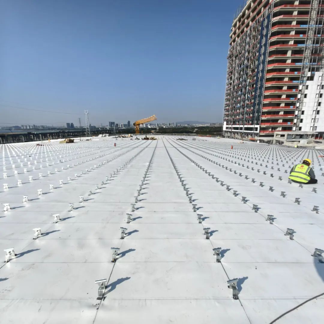 该项目金属屋面系统最大风压标准值达到-9.1Kpa,是目前国内同类型最大设计风压项目。项目深化设计阶段,项目团队联合甲方、设计院等单位对金属屋面系统多次进行共同研讨,并组织金属屋面专家对系统构造进行研究分析,前后共进行七次抗风揭试验,最终通过了全部抗风揭试验,确保金属屋面结构安全。