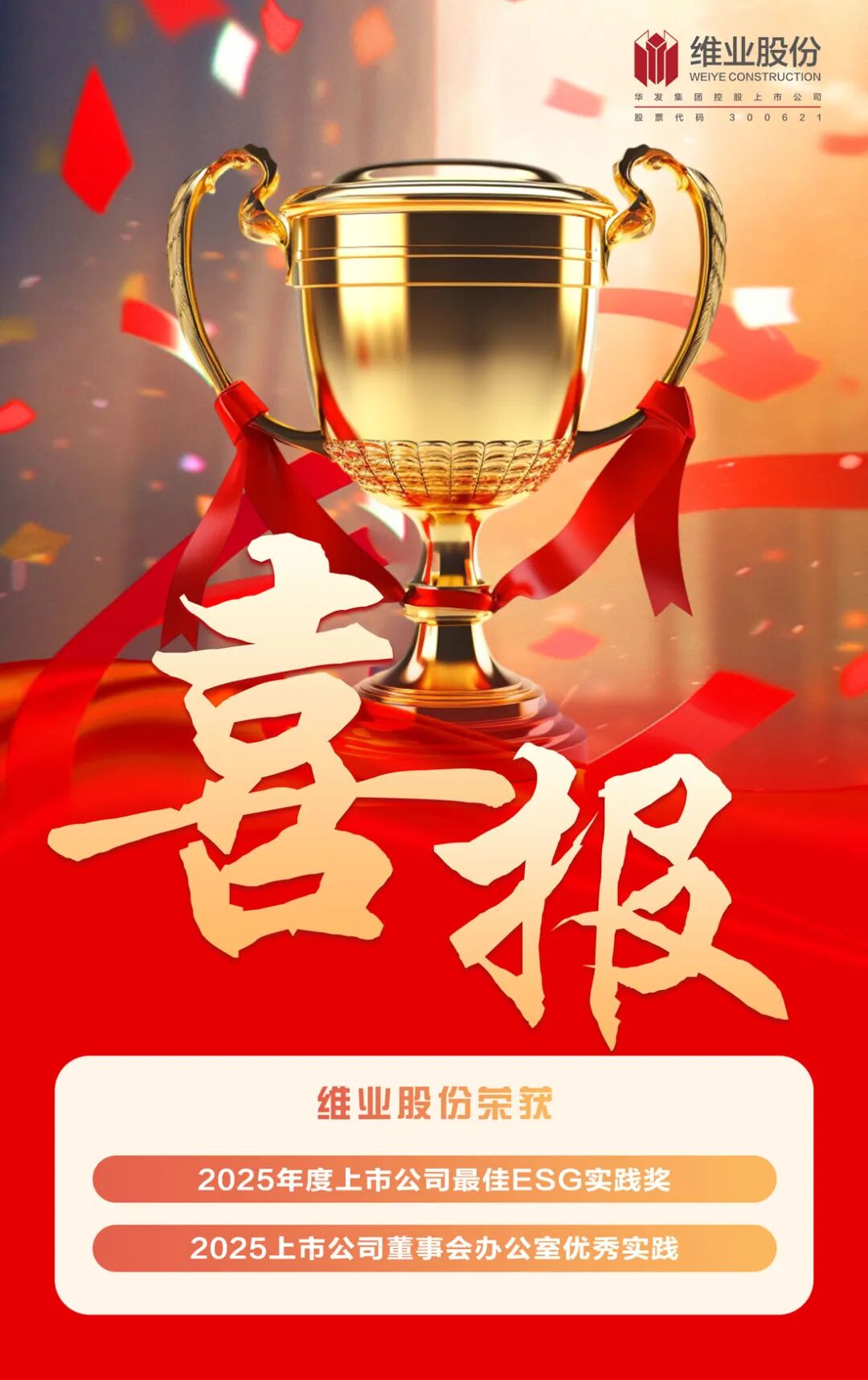 此次双殊荣的获得是对 维业股份 在公司ESG实践和董事会履职能力方面的重要肯定。未来, 维业股份 将继续依法合规运作,提升上市公司治理效能,全面推进ESG体系建设与实践,将可持续发展融入企业战略与日常运营,在创造经济价值的同时,为社会与环境贡献更多维业力量!