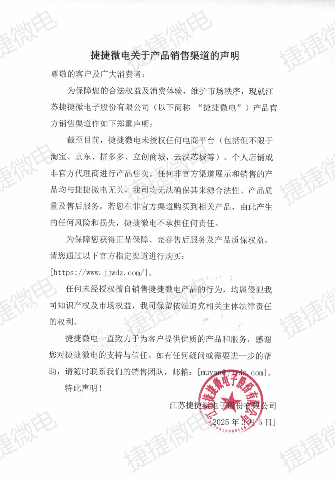 江苏捷捷微电子股份有限公司发布关于产品销售渠道的声明,称截至目前未授权淘宝、京东、拼多多、立创商城、云汉芯城等电商平台、个人店铺及非官方代理商售卖产品。