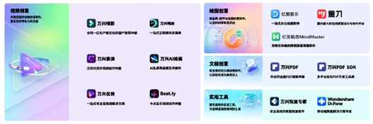 结合AIGC的广阔应用场景,万兴科技正积极拓展AI技术应用边界,面向新生代用户群,提供多能高效的AI生产工具和智能创作平台,覆盖多元创作场景,为创作者提供全流程的智能辅助。