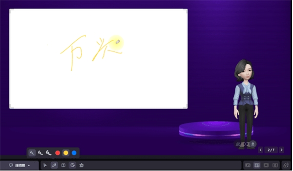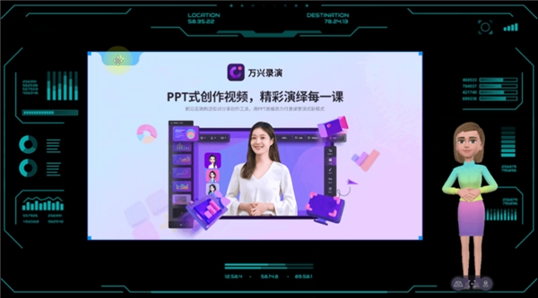 在备受关注的虚拟人录制方面,目前万兴录演支持虚拟人全身录制,用户只需点击虚拟人下方的切换按钮,就可以实现半身与全身的切换;切换为全身模式后,搭配不同的演示模式和背景图片,可以在企业级发布会、会议汇报、课程培训展示等场景中使用。