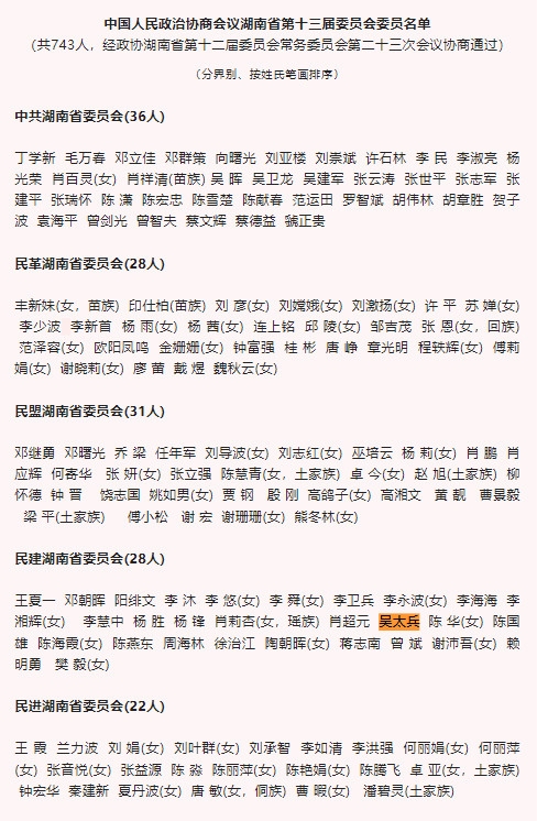 (第十三届湖南省政协委员名单公布,共 743 人通过)