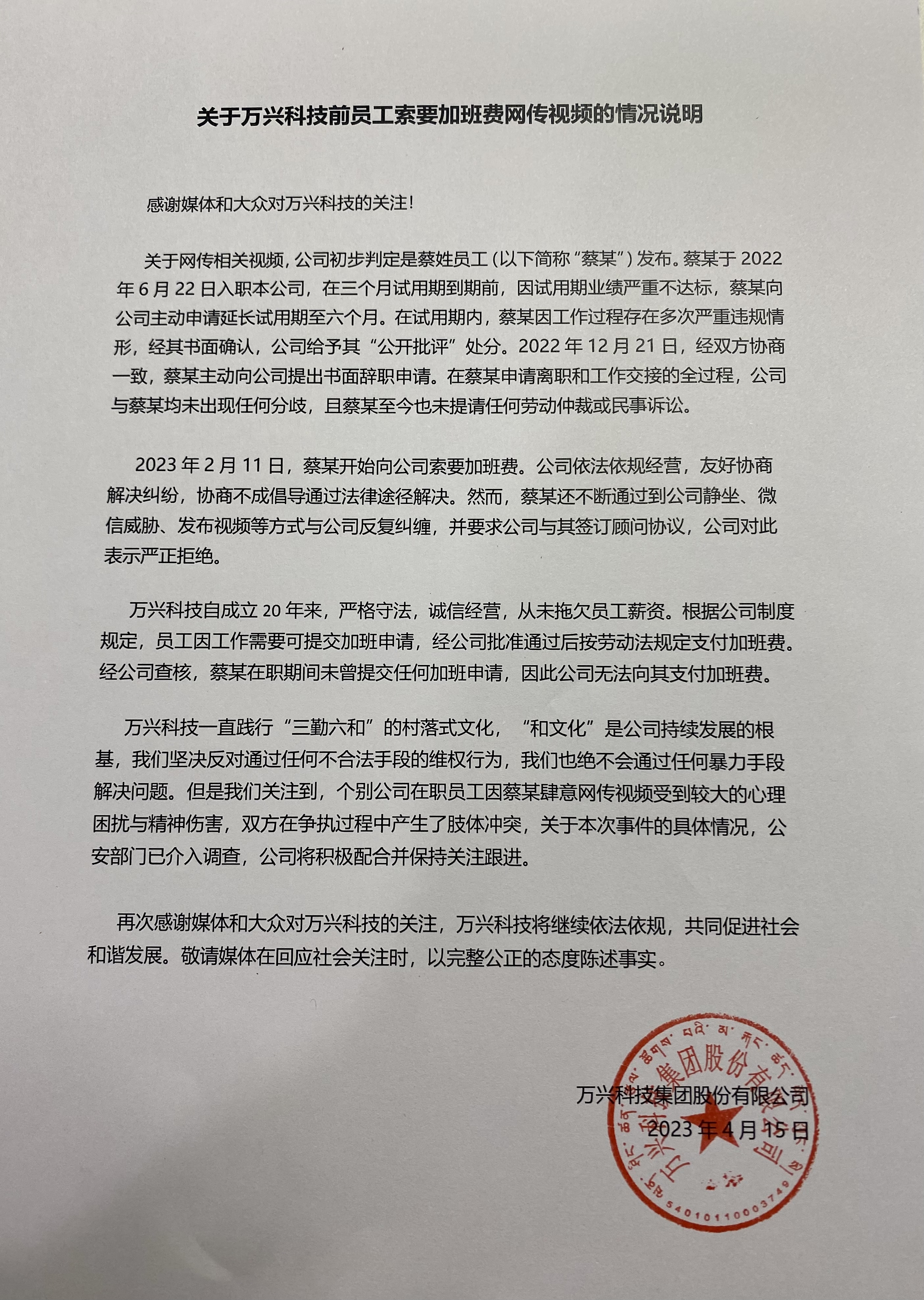 万兴科技还表示,2023年2月11日,蔡某开始向公司索要加班费。公司依法依规经营,友好协商解决纠纷,协商不成倡导通过法律途径解决。然而,蔡某还不断通过到公司静坐、微信威胁、发布视频等方式与公司反复纠缠,并要求公司与其签订顾问协议,公司对此表示严正拒绝。