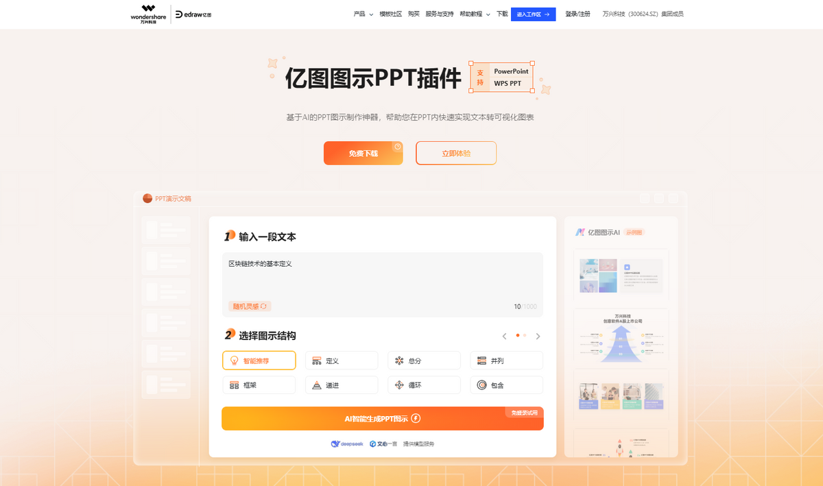 近日,AIGC软件A股上市公司万兴科技(300624.SZ)旗下绘图创意软件明星产品亿图图示持续提升AI能力,面向国内用户重磅推出PPT图示创作神器“亿图图示PPT插件”。该插件直击职场人群PPT绘图创作痛点,深度融合DeepSeek-R1推理大模型能力,创新打造AI划词转图、PPT页面生成等功能,并深度兼容Microsoft PowerPoint、WPS等主流办公软件,实现文本秒级生成可视化图示,支持“生成单页PPT”和“生成专业绘图”两种模式,助力职场办公人群在PPT文件中快速创作各类图示。目前,该插件已在国内全量发布,用户可下载插件使用或在网页端快速体验。