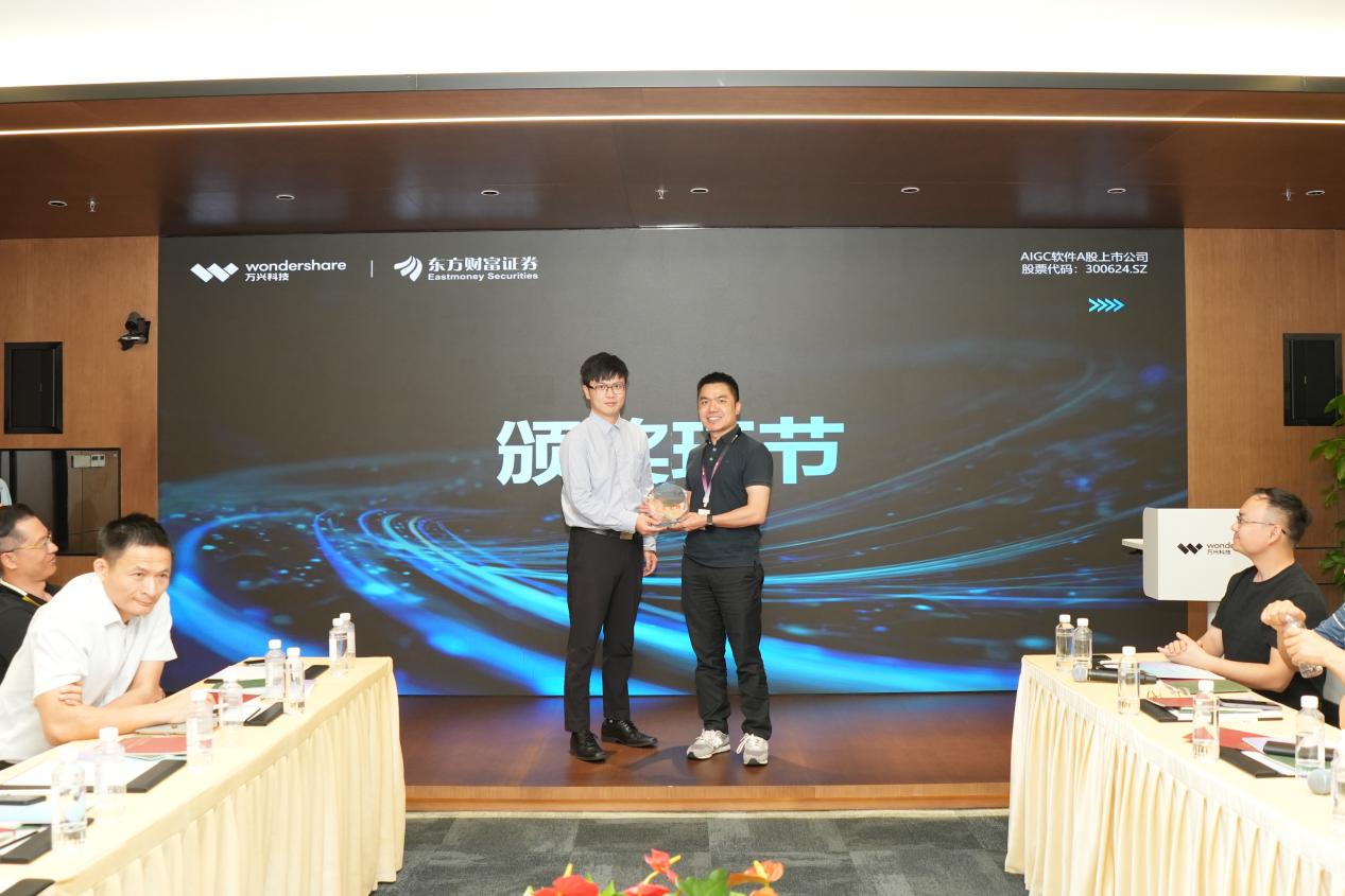 在交流环节结束后,为表彰万兴科技在投资者教育工作中的创新实践和突出贡献,深圳市证券业协会代表向万兴科技颁发了“投教先锋”奖杯。该奖项旨在表彰万兴科技在投资者关系管理方面的创新实践,搭建了企业与投资者高效沟通的桥梁。