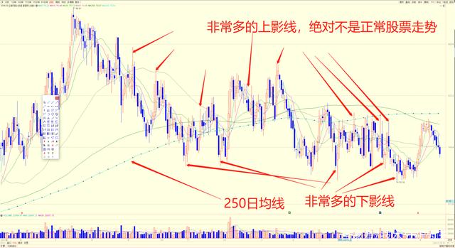 我们看一下亿联网络最近一年的走势。我之前就分享过了,只要股票走势里出现非常多的上影线和下影线,这种走势的股票绝对是有问题的。我们看到亿联网络近一年的走势里,上影线和下影线太多了,看到这种走势的股票,连基本面都不用看了,直接忽略这种股票。