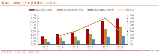 近五年 Jabra 商用耳机营收规模快速增长。根据测算,2017-2021 年,公司商用耳机营收规模 CAGR 达 27.35%,实现高速增长。2021 年实现商用耳机营业收入约 10.64 亿美元,同比增长 19.70%,增速相较于 2020 年的 40.19%有明显下降。2021 年增速下降主要是由于 2021 年下半年全球供应形势严峻,影响了部分零部件的供应,由于交付延迟和部分合同交付解除,对销售收入产生了负面影响,因此进入 2022 年时有大量订单积压。