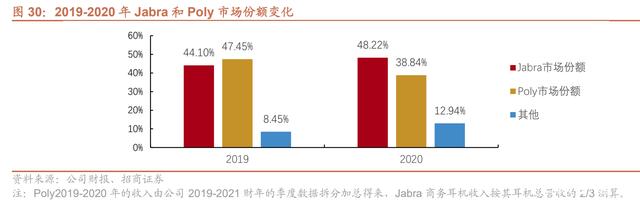 两大巨头占据商务耳机市场,竞争格局有所松动。根据 Poly 的官方介绍视频,2018 年,Poly 占据全球商务耳机 48.3%的市场份额。Plantronics 在 2018 年收购 Polycom 后,由于业务及经销渠道整合不佳,Polycom 经营稳定性受到较大影响,2019Q4 耳机业务收入与市场份额首次被 Jabra 赶超。据招商证券测算,2019 年两大巨头占据全球商务耳机市场 90%以上的份额,2020 年这一指标有所下降。公司有望瞄准时机,凭借性价比更优的产品加速开拓市场,有望占据更多份额。