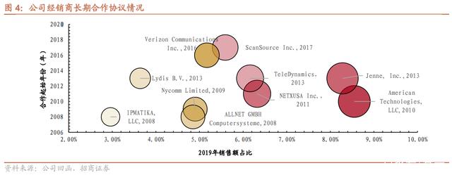 公司主要客户及合作伙伴遍布全球。公司深耕海外市场,通过每年 50 余起通讯行业展会发展经销商客户,建立起覆盖全球 100 多个国家的分销体系,服务英国电信、Verizon、AT&T、沃达丰等全球知名运营商;2018 年起,公司与微软 Teams、Zoom、腾讯等企业达成合作,成为唯一获这三大平台巨头认证的终端厂商。除了针对全球教育、医疗、建筑、金融等行业的方案设计,公司正对准国内政企发展政务解决方案,降低群众使用门槛,协助智慧党建、政协。随着全球基建通信的完善,企业通信部署逐渐从私有化向依托公网的公有化转移,市场得以下沉,规模增加,公司客户群也从中小型延伸至中大型企业。
