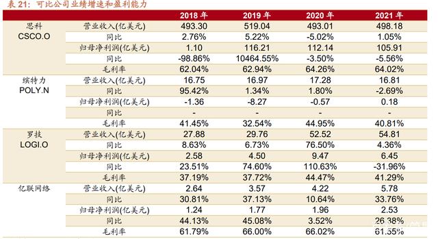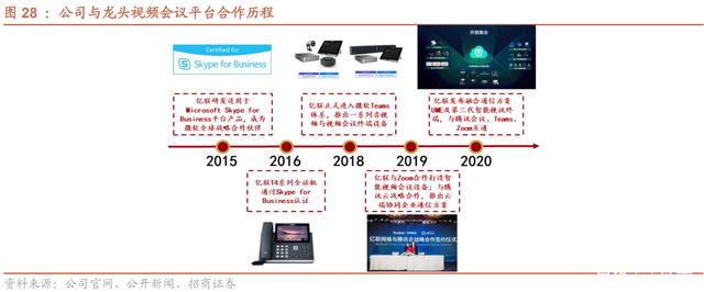 (2)疫情推动视频会议行业快速增长,公司与微软、腾讯、Zoom 等云巨头加紧合作,同时发力国内企业办公数字化市场,有望维持长期快速增长态势。视频会议行业市场下沉,规模变大:视频会议行业由私有化向公有化转型,市场开始下沉,市场规模变大,会议产品日益成为驱动公司业绩增长的重要力量。疫情后各企业加速了内部的数字化转型进程,企业用户对会议产品实际应用场景的落地要求进一步提高。亿联网络会议产品在布局、云视频部署模式、技术架构和行业解决方案等方面都具备独特优势。公司会议产品不断迭代,会议平台及智能硬件终端的处理能力均持续提升,人工智能等新技术也在产品中得到了充分的应用,并于 2021 年推出了智慧会议室解决方案。视频会议产品也同微软、Zoom 以及腾讯会议打开生态认证,该条业务线自成立以来,连续多年保持快速增长。