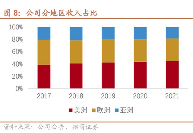 公司产品销售以海外市场为主,拥有强大的经销网络。2021 年度公司的销售收入中欧洲和美洲市场的收入占比 80%以上。在公司海外市场开拓过程中,经过多年积累已经建立起覆盖全球 100 多个国家的分销体系,主要经销商与公司形成了长期稳定的合作关系,是公司的核心竞争力之一;公司坚持轻资产运营,将人力密集型生产部分外包,委托给外协加工工厂。