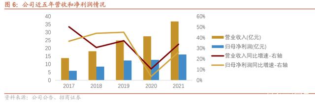 公司 2021 年实现营收 36.84 亿元,同比增长 33.76%,归母净利润 16.16 亿元,同比增长 26.38%。2017-2021 年,公司营收 CAGR 达 27.64%,归母净利润 CAGR 达 28.59%。其中 2020 年受新冠疫情和美元汇率波动的影响,公司业绩出现短期的波动,营收和净利润增速同比有所下滑,其余年份公司营收和净利润均保持较高增速。