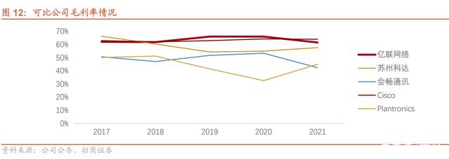 公司毛利率显著高于同行业平均水平。2021 年公司综合毛利率为 61.55%,高毛利率主要来源于 CT 搭载的软件、强大的经销网络和外协加工的生产模式。可比公司毛利率方面,亿联网络(61.55%)和Cisco(64.02%)处于行业领先地位,高于苏州科达(57.63%),会畅通讯(42.39%)和 Plantronics(44.95%)。